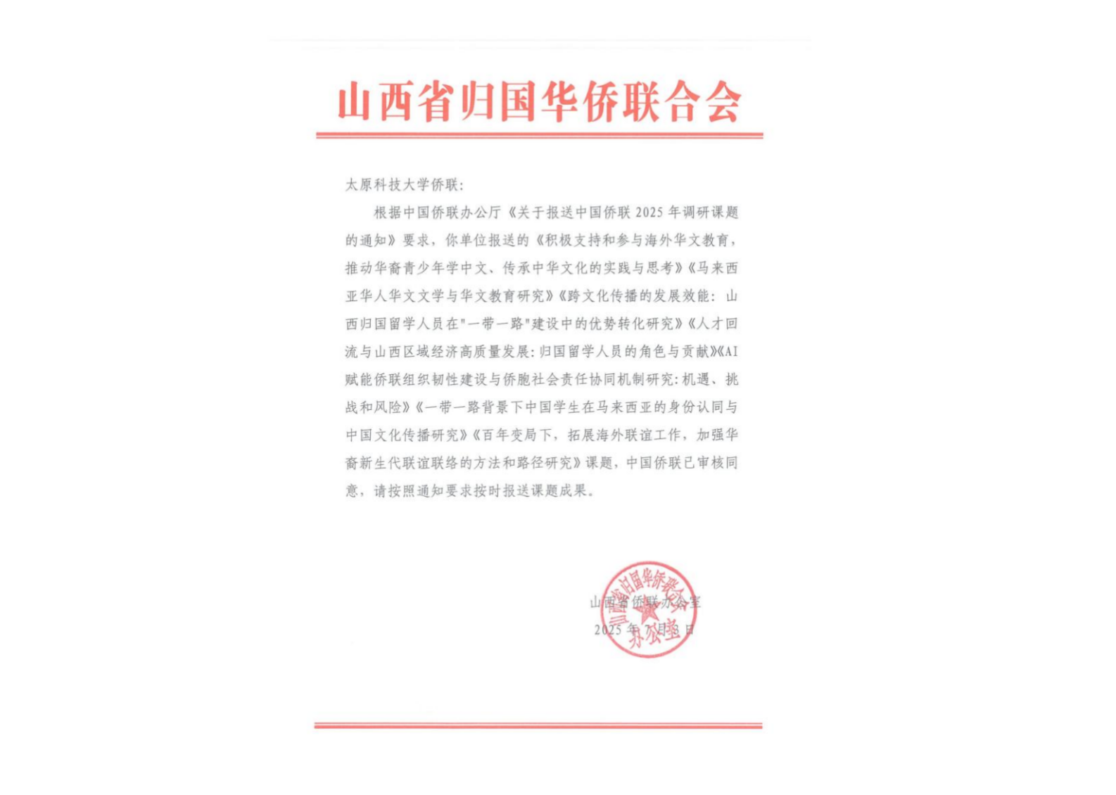 365官网侨留联7项调研课题获中国侨联审核通过为认真学习贯彻习近平总书记关于侨务工作和群团工作的重要论述,推动海外华文教育、促进中外文化交流、助力国家发展战略,365官网侨留联充分发挥桥梁纽带作用,精心组织报送的7项中国侨联2025年调研课题已全部通过中国侨联审核同意。