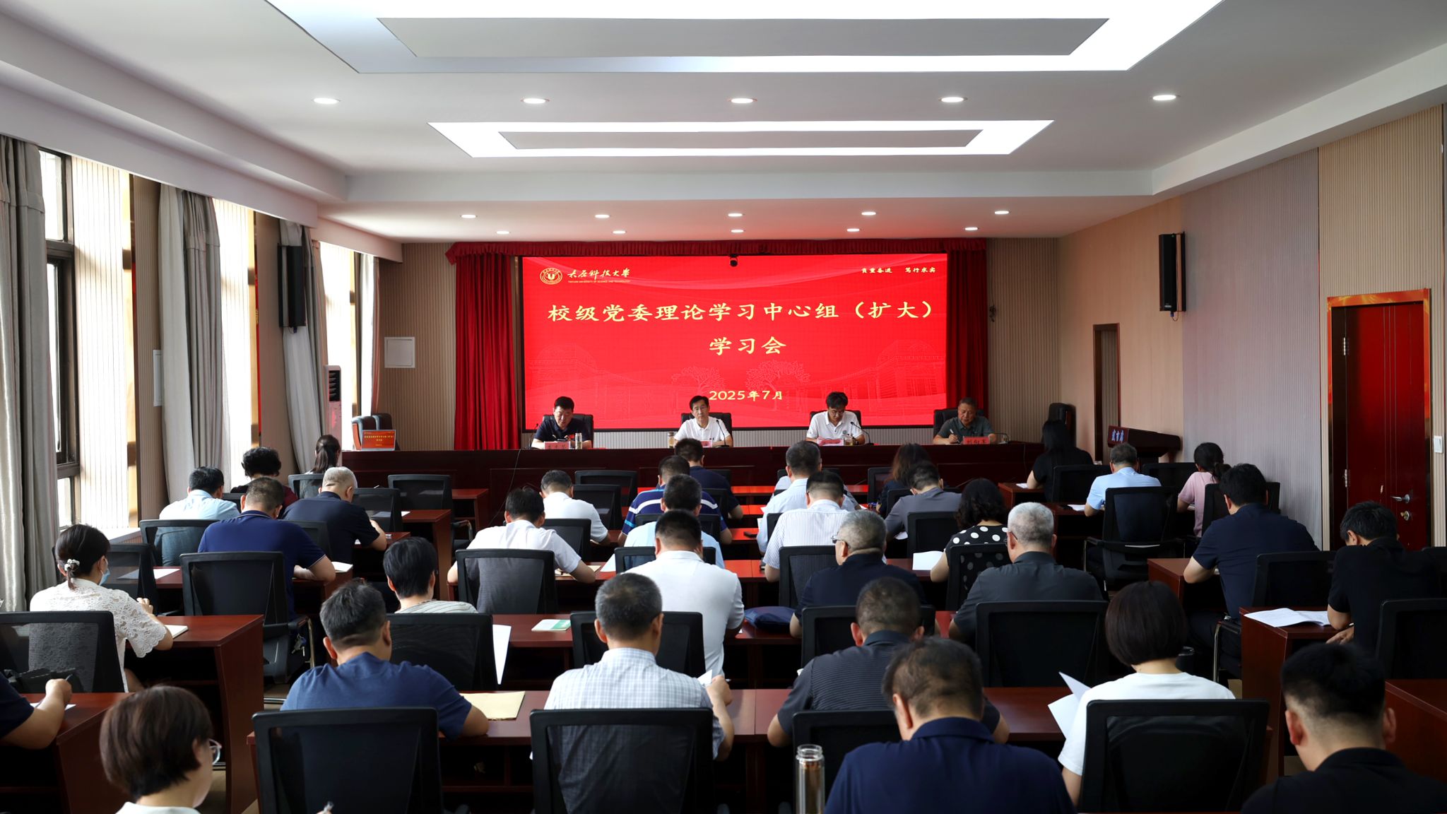 7月7日下午,365官网在主楼4层会议室召开校党委理论学习中心组(扩大)学习会,校党委书记白培康主持会议并讲授深入贯彻中央八项规定精神学习教育专题党课。校党委理论学习中心组成员、全校正处级干部、年轻干部代表参加。