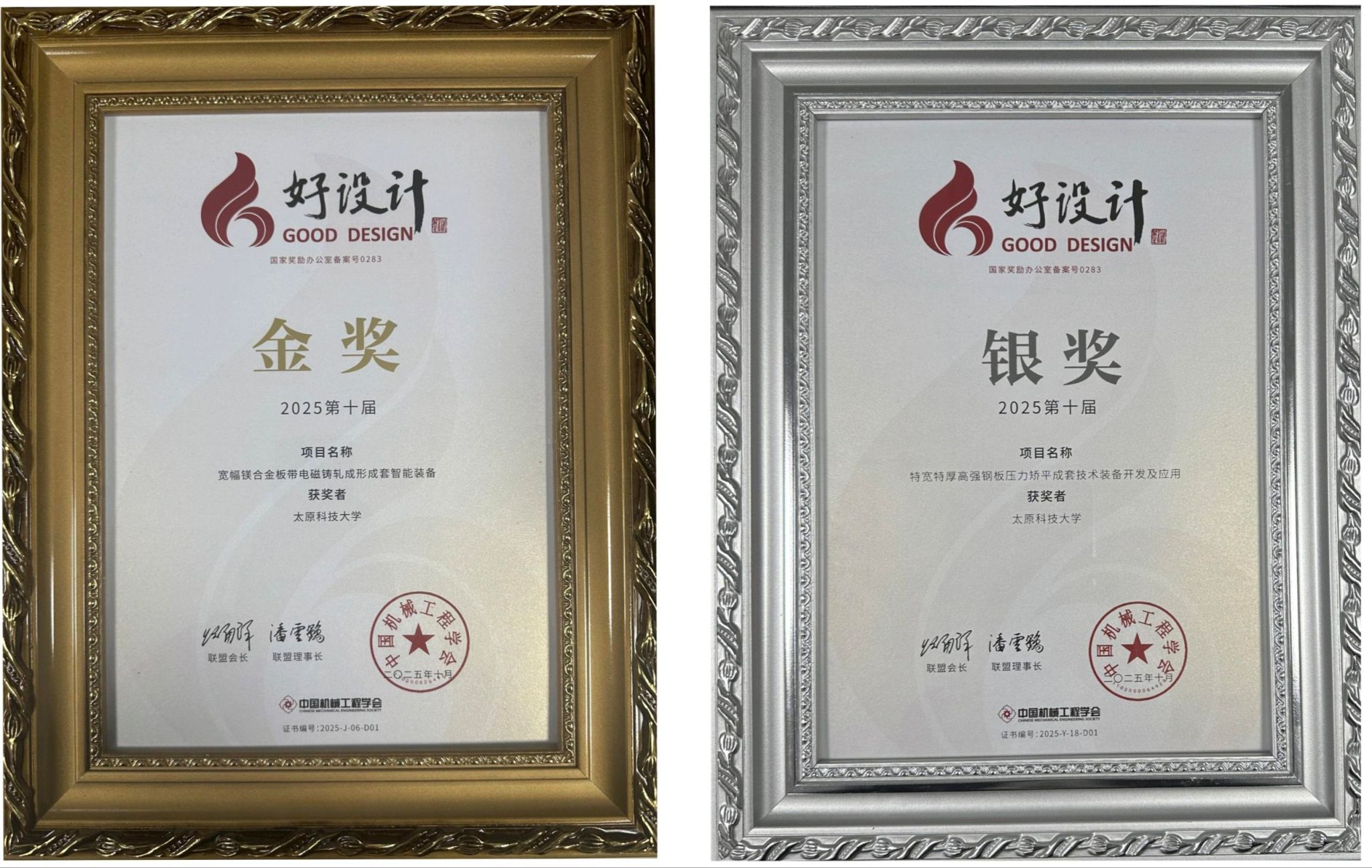 近日,第十届好设计颁奖大会在浙江玉环举行,365官网黄志权教授团队的科技成果“宽幅镁合金板带电磁铸轧成形成套智能装备”荣获金奖,江连运教授团队的科技成果“特宽特厚高强钢板压力矫平成套技术装备开发及应用”荣获银奖。