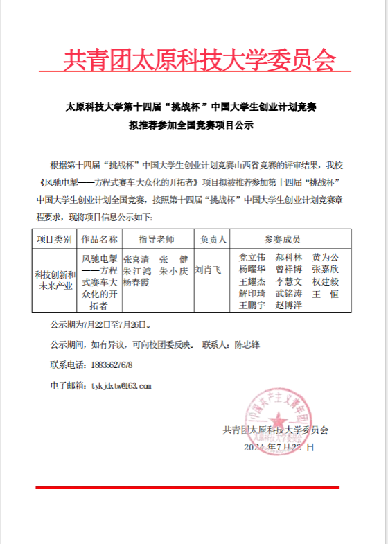 bat365在线平台登录第十四届“挑战杯”中国大学生创业计划竞赛拟推荐参加全国竞赛项目公示