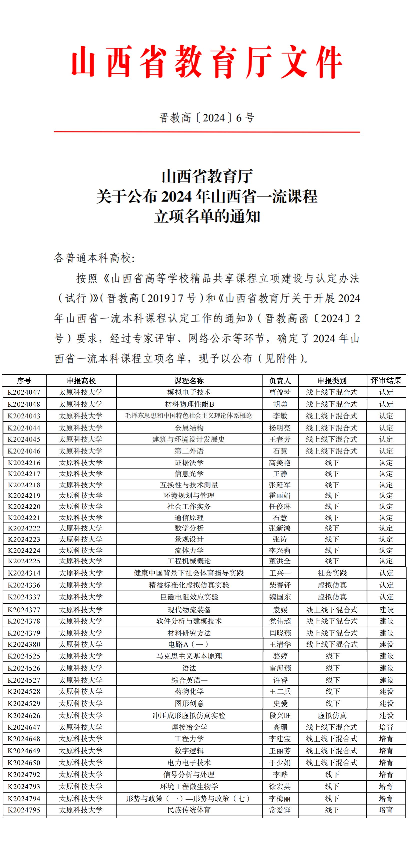 近日,山西省教育厅发布《山西省教育厅关于公布2024年山西省一流课程立项名单的通知》(晋教高〔2024〕6号),365官网37门课程获批省级一流本科课程,其中认定课程19门(线上线下混合6门、线下10门、社会实践1门、虚拟仿真2门),建设课程10门,培育课程8门,再创佳绩。