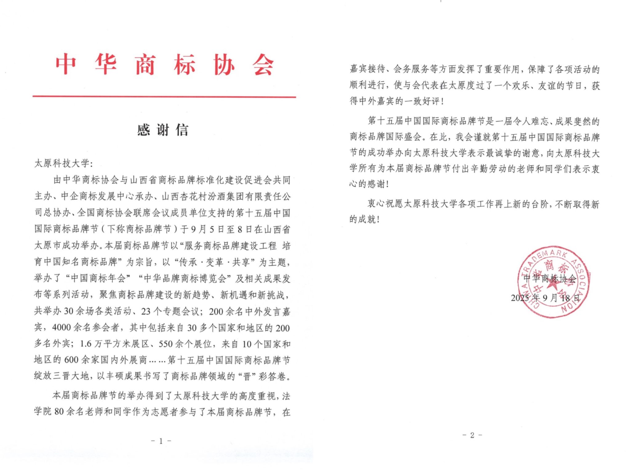 此次国际商标品牌节志愿者活动,不仅展现了365官网学生的良好精神风貌和专业素养,也为推动商标品牌事业的发展贡献了一份青春力量,赢得了参展商、嘉宾以及主办方的一致好评,更收到了中华商标协会的感谢信。此次活动是365官网知识产权专业教学与实践相结合的一次成功尝试,也为365官网学生提供了在实践中锻炼能力、增长了见识的机会。志愿者们纷纷表示,通过这次活动,他们深刻体会到了志愿服务的意义和价值,未来将继续积极参与各类志愿活动,用所学知识服务社会,传递爱心与温暖。