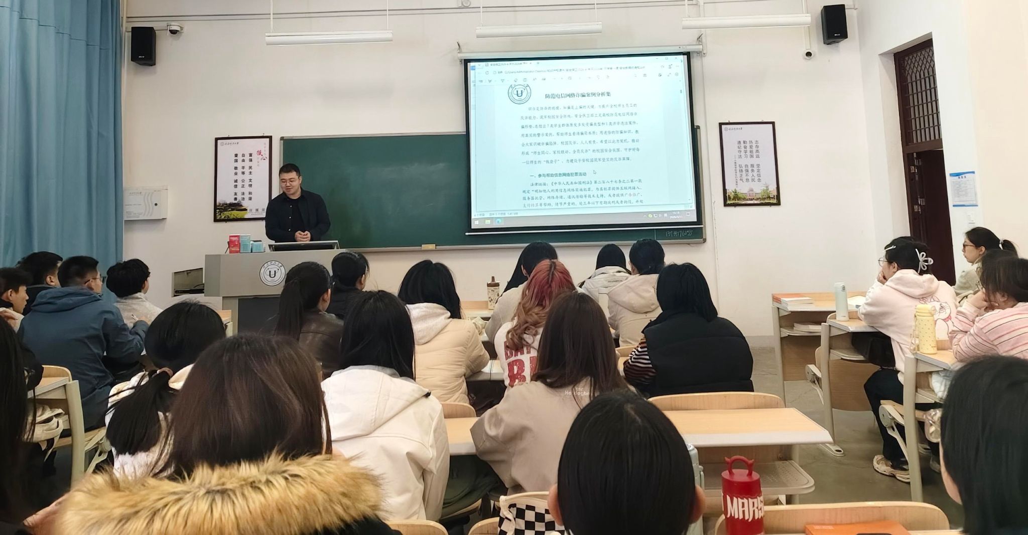 学院将安全主题班会作为素养培育主阵地,定期组织开展电信网络诈骗防范、消防安全、心理健康、网络安全、交通安全、校园欺凌防治等系列专题教育。结合真实案例以案释法、以例警人。针对刷单诈骗、冒充好友借钱、校园贷等高发骗局,以及高校宿舍违规用电引发火灾、实验室操作不当致险等典型事故,辅导员结合法学专业知识解读相关法律法规,引导学生剖析风险根源、掌握防范技巧。通过案例研讨、情景模拟、互动问答等形式,变单向灌输为主动思考,让学生在辨析中树立安全底线思维,实现从“要我安全”到“我要安全、我会安全”的观念转变,筑牢思想与行为双重防线。