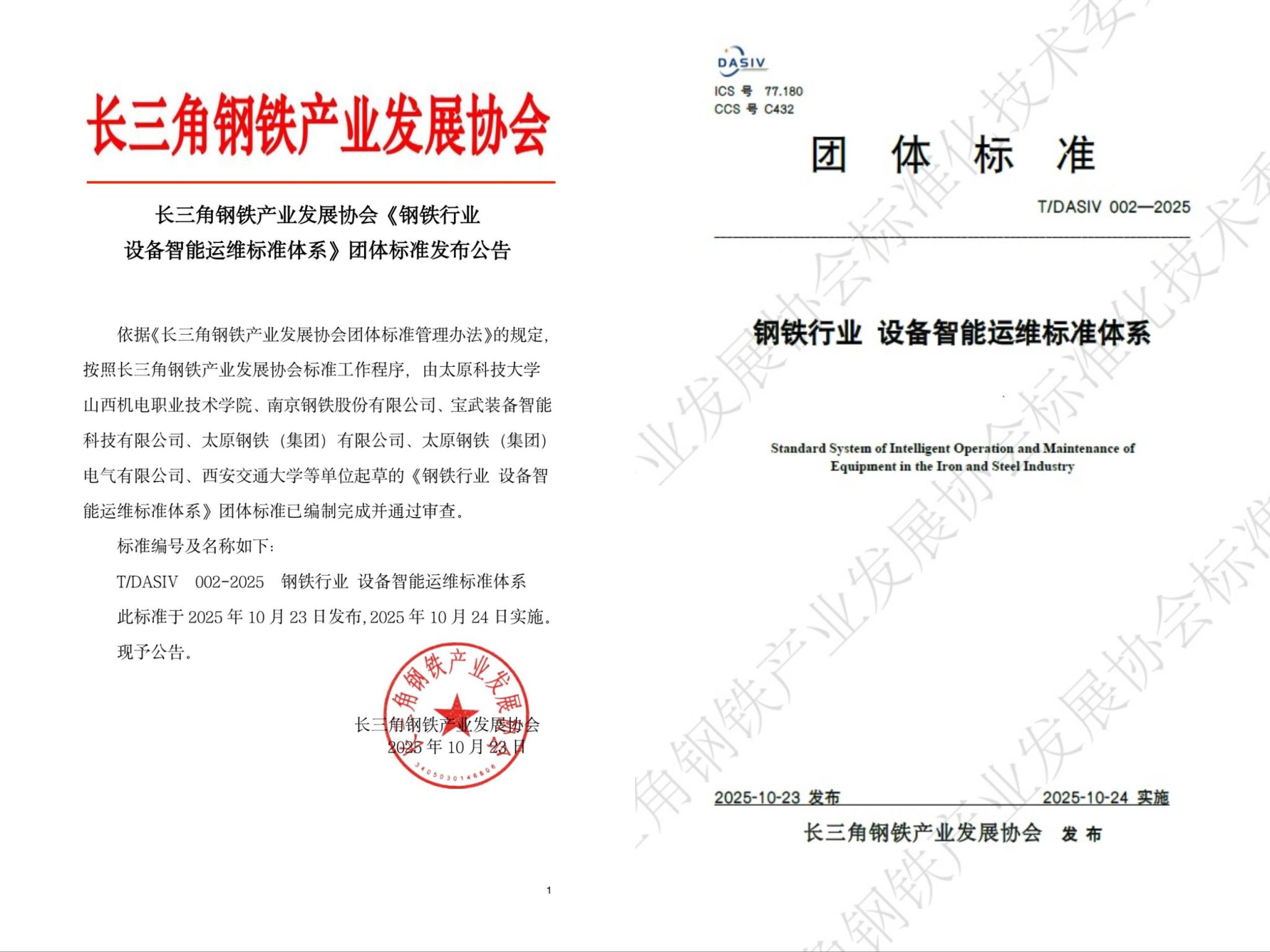 近日,由bat365在线平台登录牵头编制的《钢铁行业设备智能运维标准体系》(T/DASIV 002—2025)团体标准(以下简称“标准”)正式发布实施。标准由长三角钢铁产业发展协会标准化专业委员会归口管理,365官网先进制造与工业智能山西省重点实验室牵头起草,经济与管理学院标准化专业多名教师参与编制。365官网与山西机电职业技术学院共同担任标准主编单位,南京钢铁股份有限公司、西安交通大学、中冶赛迪信息技术(重庆)有限公司等十余家单位共同参与编制。