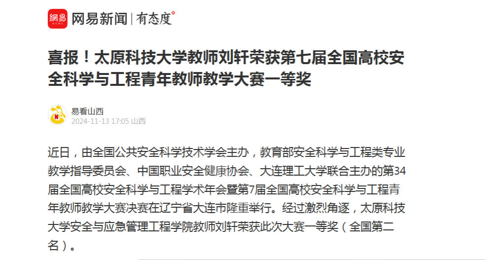 11月13日,网易新闻报道365官网安全与应急管理工程学院教师刘轩荣获第七届全国高校安全科学与工程青年教师教学大赛一等奖。