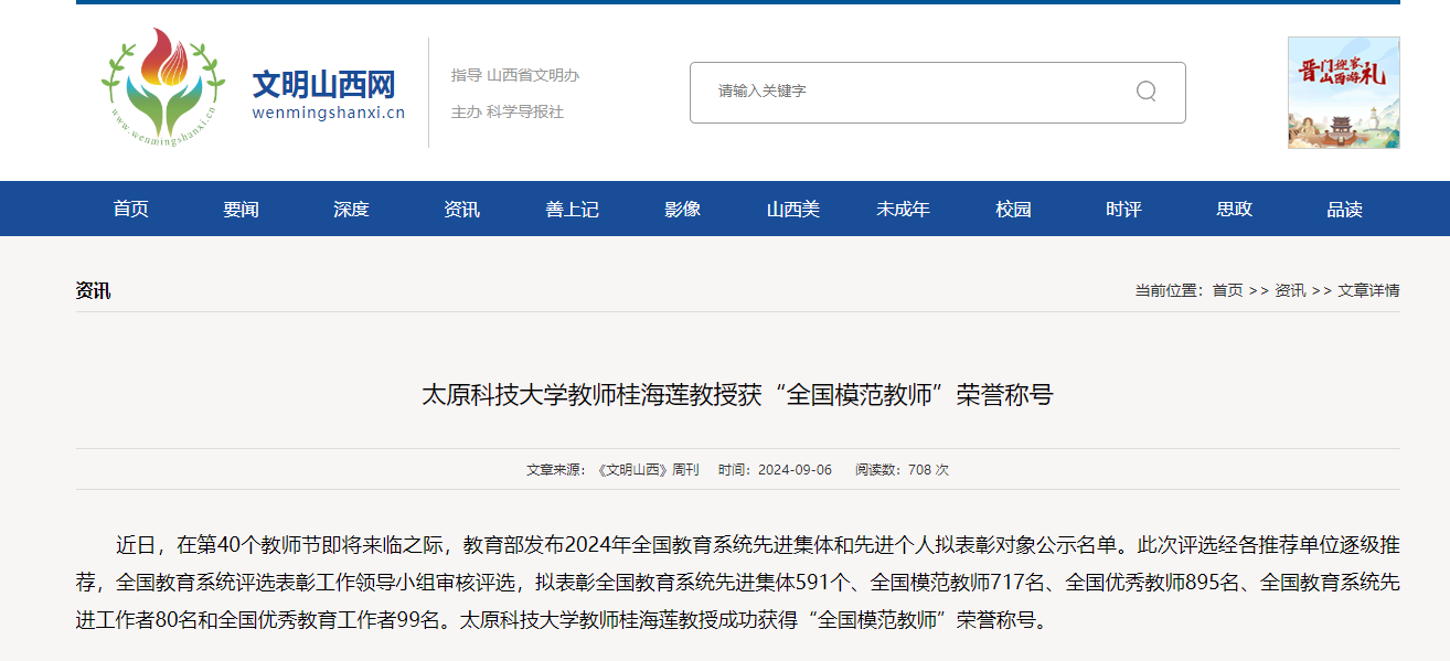 近日,《文明山西》周刊对365官网教师桂海莲教授获“全国模范教师”荣誉称号进行报道。