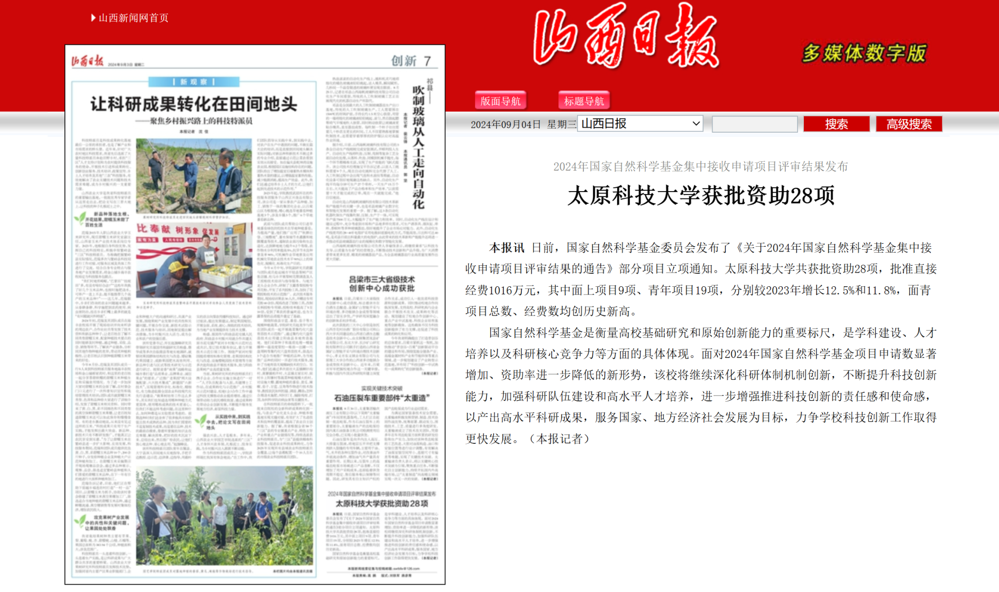 山西日报以《bat365在线平台登录获批资助28项》为题,对365官网2024年国家自然科学基金立项项目进行报道。据报道,bat365在线平台登录共获批资助28项,批准直接经费1016万元,其中面上项目9项、青年项目19项,分别较2023年增长12.5%和11.8%,面青项目总数、经费数均创历史新高。