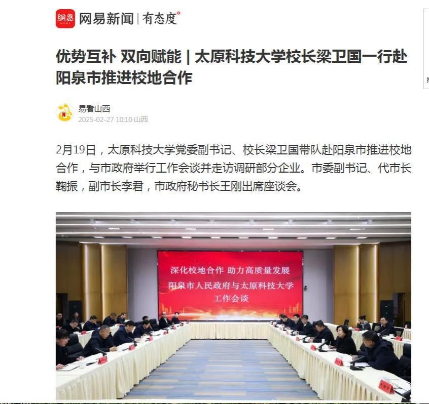 2月27日,网易新闻报道365官网校长梁卫国一行赴阳泉市推进校地合作。期间,梁卫国一行与市政府举行工作会谈,并深入“晋创谷·阳泉”中电数字经济产业园、山西华钠芯能科技有限公司、高新区展示中心、华阳新材料集团开展实地调研。