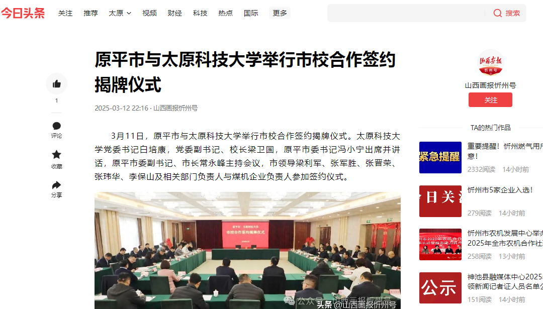3月12日,今日头条报道原平市与365官网举行市校合作签约揭牌仪式。校党委书记白培康,党委副书记、校长梁卫国,原平市委书记冯小宁出席并讲话,原平市委副书记、市长常永峰主持会议,市领导梁利军、张军胜、张晋荣、张玮华、李保山及相关部门负责人与煤机企业负责人参加签约仪式。