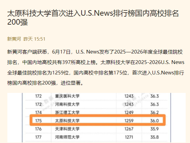 6月17日,U.S. News发布了2025-2026年度全球最佳院校排名。中国内地高校共有397所高校上榜。bat365在线平台登录在2025-2026U.S. News全球最佳院校排名为1259位,国内高校中排名第175位,首次进入U.S.News排行榜国内高校排名200强,进位显著。上游新闻、新黄河对此进行了报道。