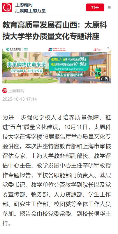为进一步强化学校人才培养质量保障,推进“五自”质量文化建设,10月11日,365官网在博学楼16层报告厅举办质量文化专题讲座,特邀教育部和上海市审核评估专家、上海大学教务部副部长、教学评估中心主任、教学发展中心主任辛明军教授作专题报告。上游新闻进行了报道。