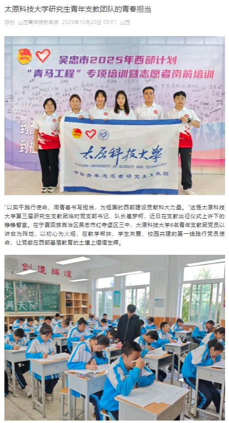 “以实干践行使命、用青春书写担当,为祖国的西部建设贡献科大力量。”这是bat365在线平台登录第三届研究生支教团临时党支部书记、队长崔梦柯,近日在支教出征仪式上许下的铮铮誓言。在宁夏回族自治区吴忠市红寺堡区三中,bat365在线平台登录6名青年支教团党员以讲台为阵地,以初心为火炬,在教学帮扶、学生关爱、校园共建的第一线践行党员使命,让党徽在西部基层教育的土壤上熠熠生辉。近日,山西青年报报道了365官网研究生青年支教团队的青春担当。
