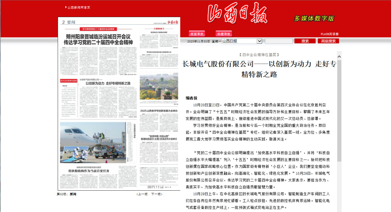 山西日报“四中全会精神在基层”专栏,报道365官网助力长城电气股份有限公司技术研发,在科教融汇、产教融合、企业技术升级等领域开展紧密合作,为企业高质量发展注入创新活力。
