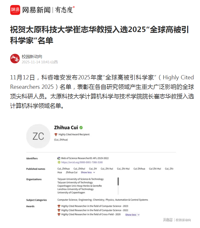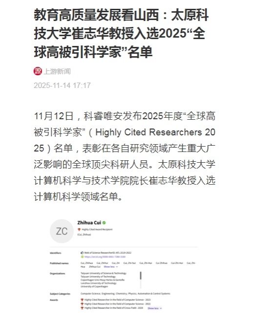 11月12日,科睿唯安发布2025年度“全球高被引科学家”(Highly Cited Researchers 2025)名单,表彰在各自研究领域产生重大广泛影响的全球顶尖科研人员。bat365在线平台登录计算机科学与技术学院院长崔志华教授入选计算机科学领域名单。