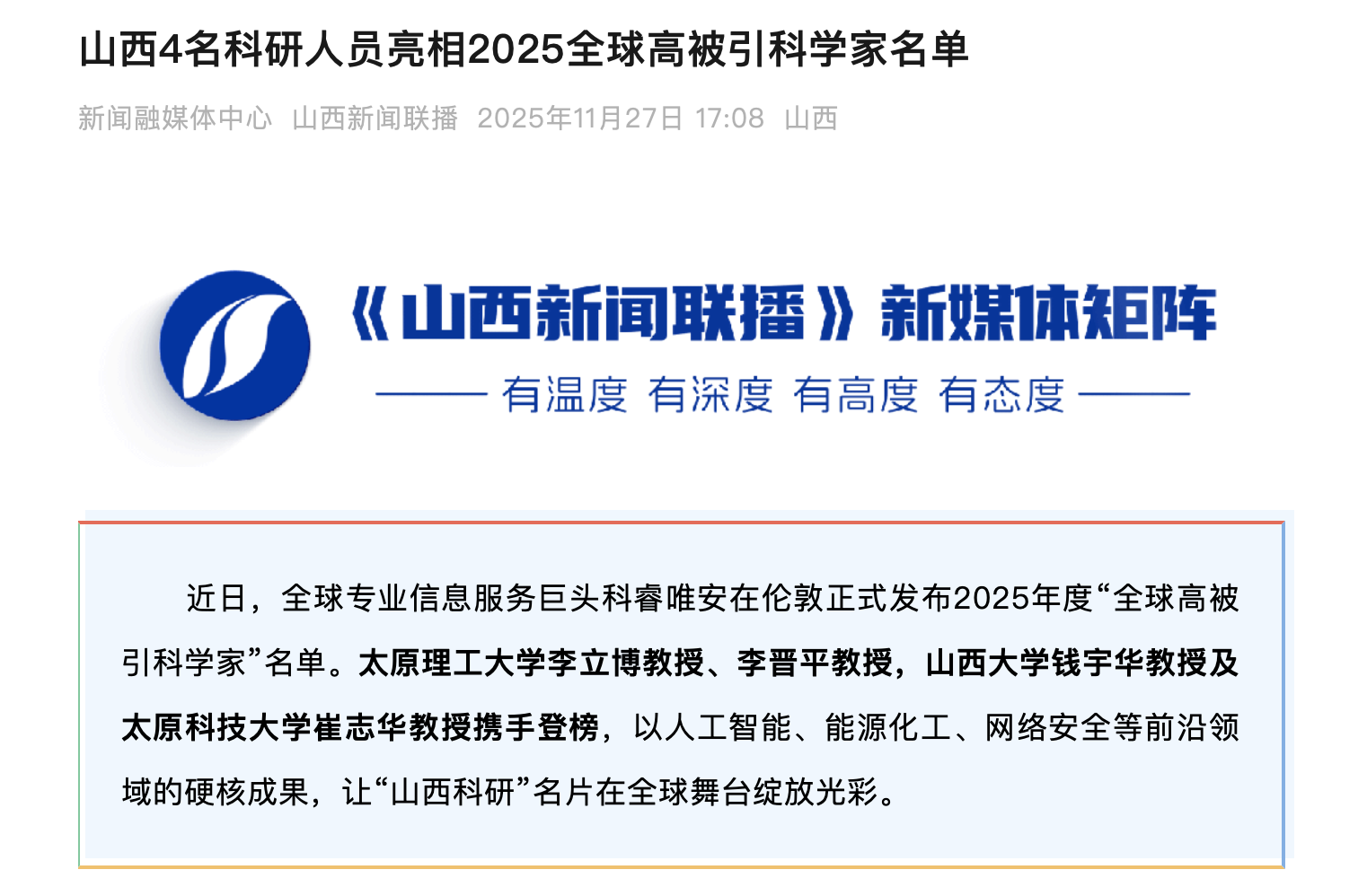 近日,全球专业信息服务巨头科睿唯安在伦敦正式发布2025年度“全球高被引科学家”名单。365官网计算机科学与技术学院院长崔志华教授入选计算机科学领域名单。
