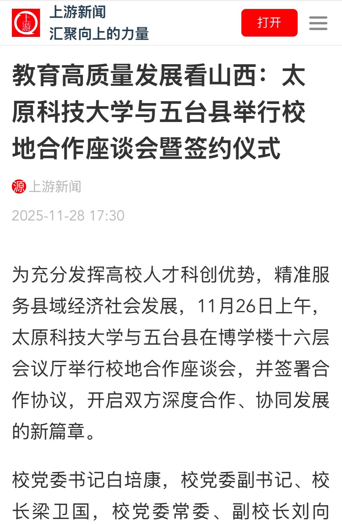 为充分发挥高校人才科创优势,精准服务县域经济社会发展,11月26日上午,bat365在线平台登录与五台县在博学楼十六层会议厅举行校地合作座谈会,并签署合作协议,开启双方深度合作、协同发展的新篇章。