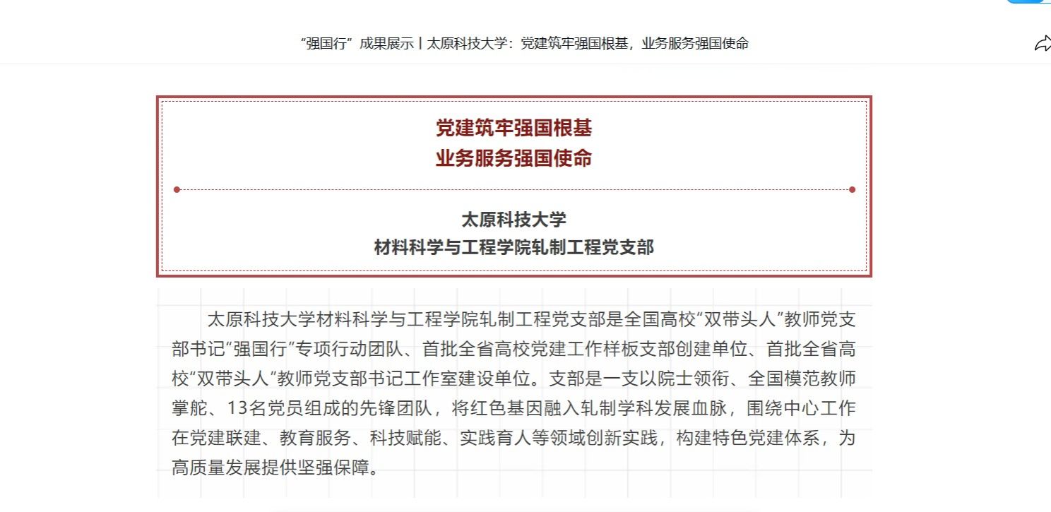 bat365在线平台登录材料科学与工程学院轧制工程党支部是全国高校“双带头人”教师党支部书记“强国行”专项行动团队、首批全省高校党建工作样板支部创建单位、首批全省高校“双带头人”教师党支部书记工作室建设单位。支部是一支以院士领衔、全国模范教师掌舵、13名党员组成的先锋团队,将红色基因融入轧制学科发展血脉,围绕中心工作在党建联建、教育服务、科技赋能、实践育人等领域创新实践,构建特色党建体系,为高质量发展提供坚强保障。近日,全国高校思想政治工作网对此进行了报道。