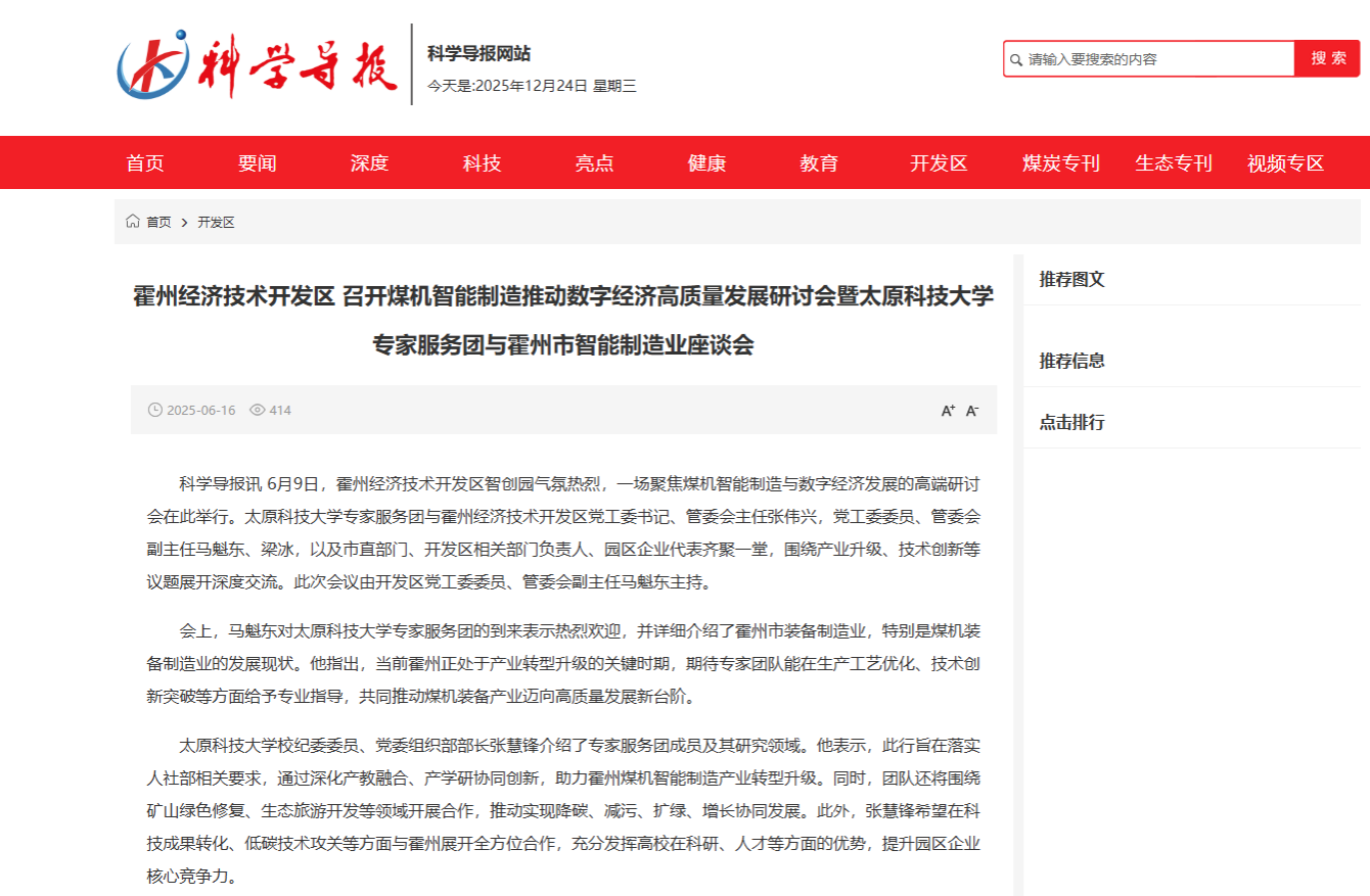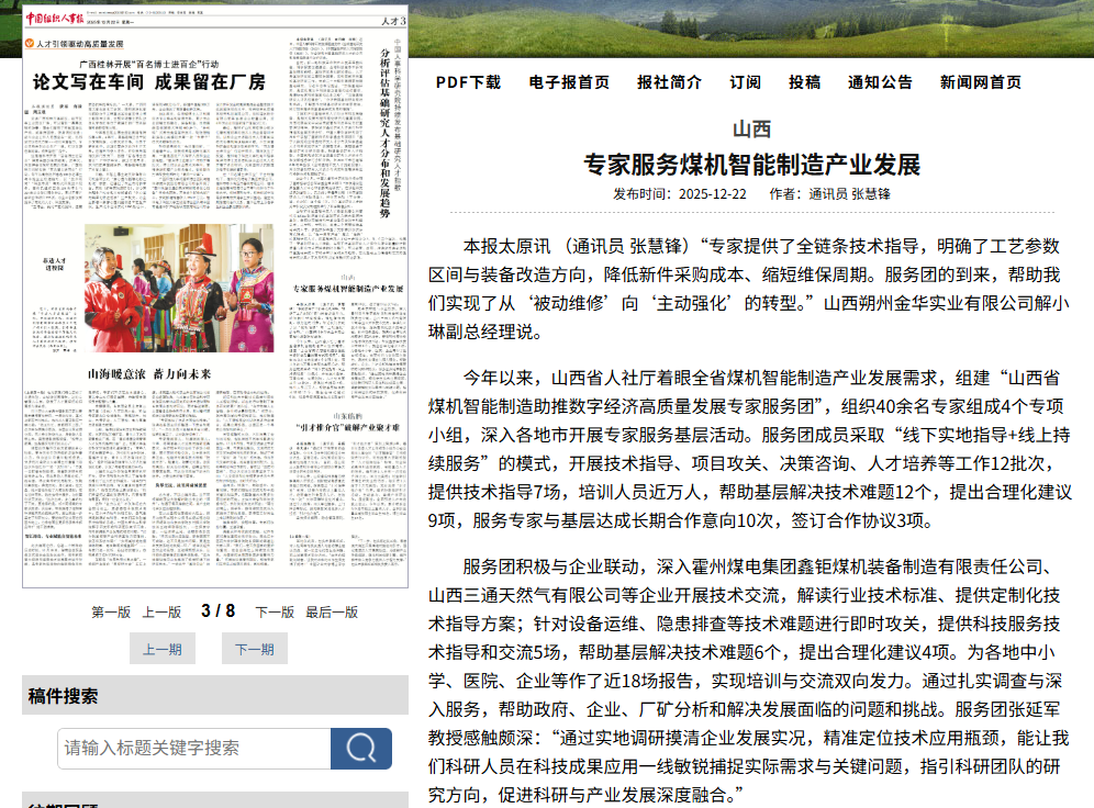 近日,中国组织人事报、科学导报对365官网组建的“山西省煤机智能制造助推数字经济高质量发展专家服务团”进行了报道。据悉,今年以来,山西省人社厅着眼全省煤机智能制造产业发展需求,依托bat365在线平台登录组建“山西省煤机智能制造助推数字经济高质量发展专家服务团”,聚焦临汾、霍州、汾西等县区,就煤机装备再制造及安全防护装备、煤矿瓦斯检测、矿山绿色修复、文旅项目策划、现代企业管理等关键技术进行现场指导。该项目成功入选国家人力资源和社会保障部2025年专家人才服务基层活动,这是我省仅有的2个入选项目之一,也是365官网充分发挥专家人才引领带动作用,精准助力基层高质量发展和乡村振兴的重要举措。