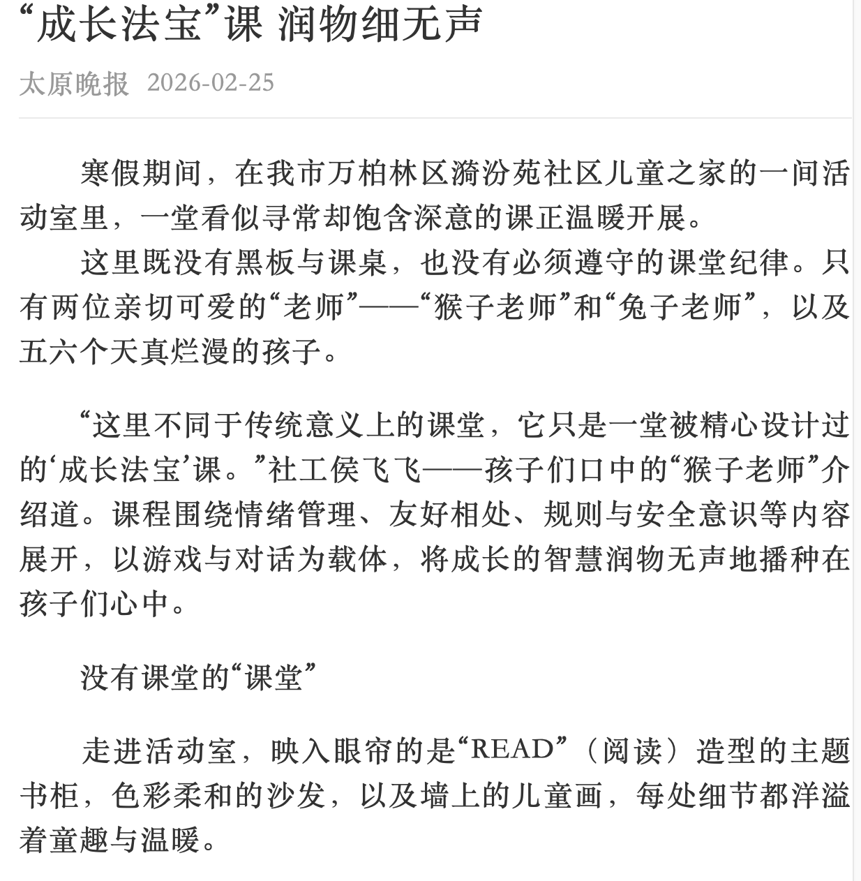 寒假期间,365官网社会工作专业学生在校外导师的悉心指导下,以青春之名扎根社区沃土,开展了一场温暖人心的服务实践。他们用热忱守护童真,在躬身实践中诠释责任担当,点滴付出赢得社区居民的广泛赞誉,彰显了科大学子的精神风貌、专业情怀和使命担当。2026年2月25日,《太原晚报》“新春走基层”专栏以《“成长法宝”课润物细无声》为题,专题报道了此次服务实践。