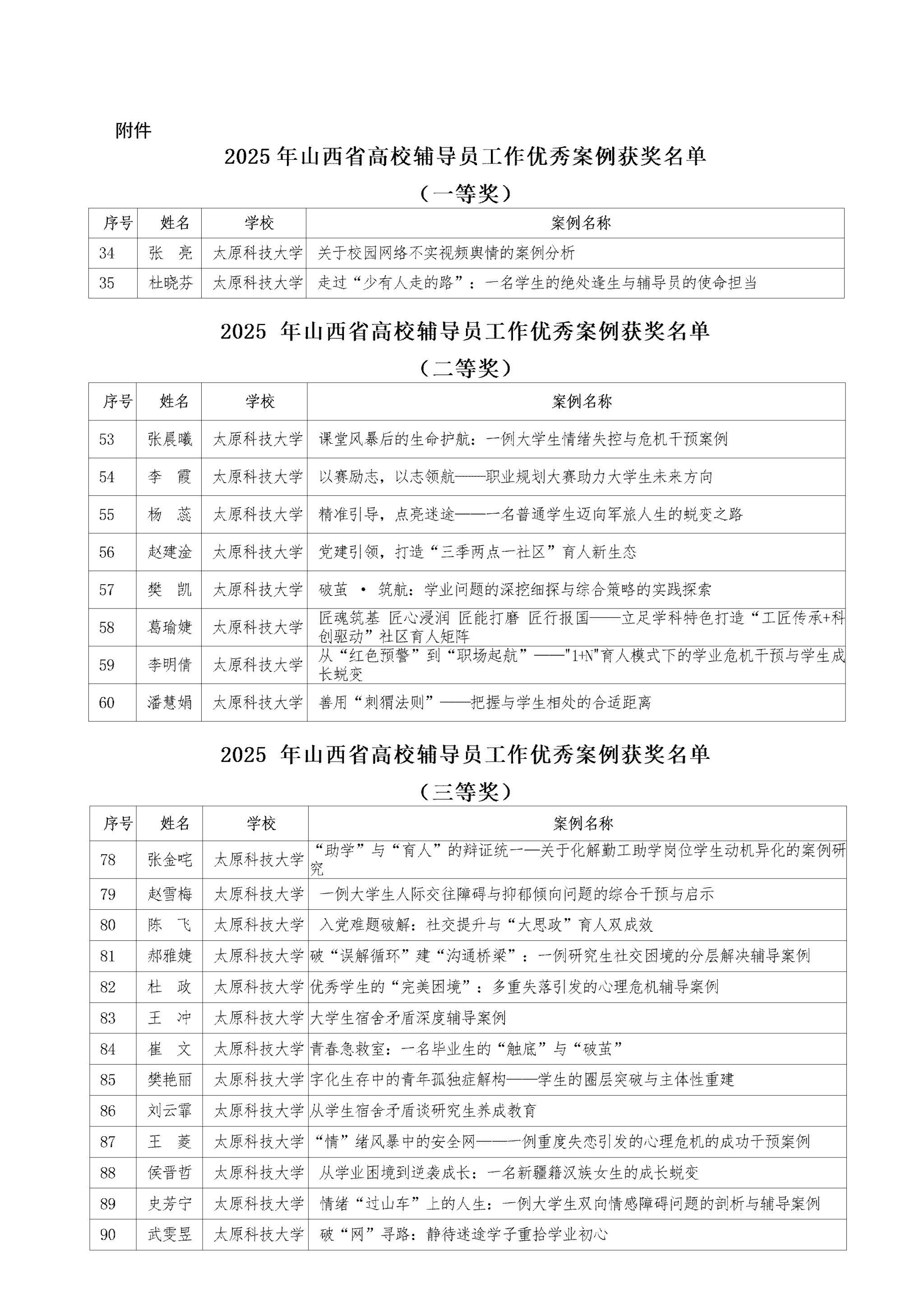 为深入落实《山西省教育厅关于开展高校辅导员队伍建设改革试点的通知》(晋教政函〔2024〕46号),总结推广学生工作先进经验,推动辅导员队伍专业化、职业化、专家化发展,山西省教育厅开展了2025年高校辅导员工作优秀案例征集评选活动。365官网征集辅导员工作案例65个,最终23个获奖,其中一等奖2项、二等奖8项、三等奖13项。