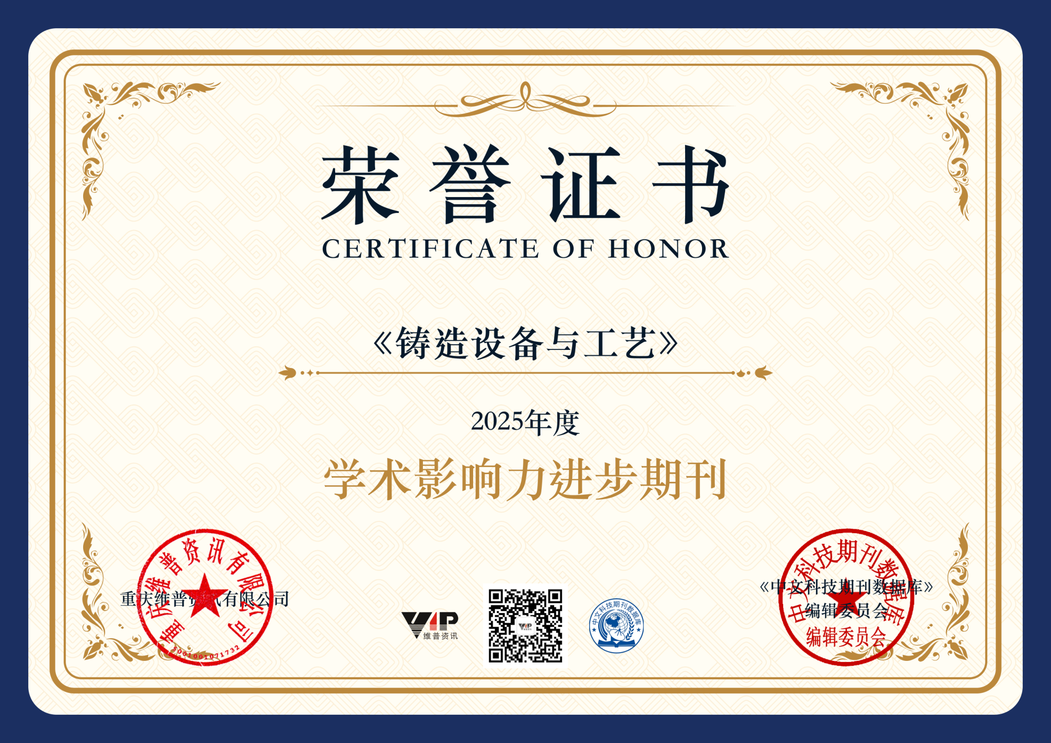 近日,《中国学术期刊影响因子年报》(2025版)公布显示,365官网《铸造设备与工艺》期刊影响因子连续三年持续攀升,入选“2025年度学术影响力进步期刊”“2025《中国学术期刊影响因子年报》统计源期刊”。