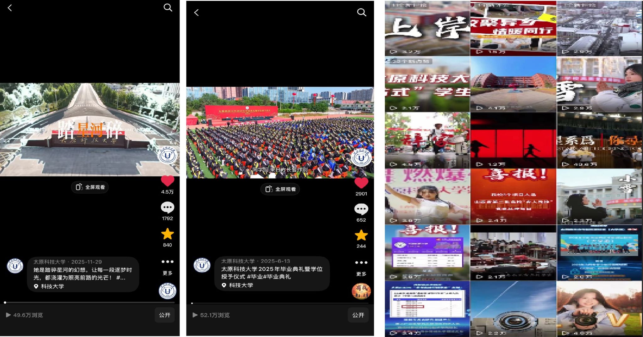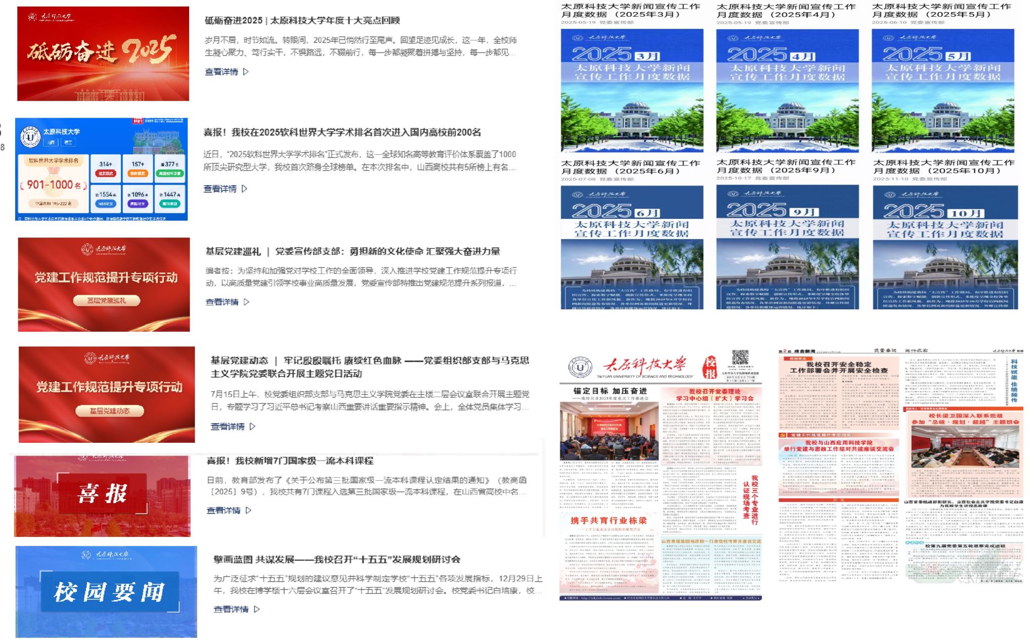 加强有组织宣传报道,新闻报道有“深度”。制定下发《新闻宣传工作管理办法》《关于进一步加强校园新闻宣传报道的意见》,对全校各单位新闻宣传工作实行每月通报、年度考核。围绕学校重点工作、重要节点、重大活动,聚焦人才培养、科技创新、学科建设等做好专题报道,推出“党建工作规范提升专项行动”“访企拓岗促就业”等专题专栏,策划“回眸‘十四五’再启新征程”“bat365在线平台登录年度十大亮点”“砥砺奋进2025”系列报道,梳理回顾这一年来以及“十四五”期间学校在改革发展的非凡征程中取得的丰硕成果,全方位呈现学校办学育人成效。有效整合“报、站、网、微、屏、端”各类校园媒体资源,充分运用图文声频、视频直播等多媒体手段,讲好科大故事,传播科大声音。完善宣传片内容,持续推进校报改革,策划《科大星语》《校友故事》宣传报道校园先进人物事迹,优化校园广播内容,推出线上音频栏目,公众号全年发布推文700多篇,微博发布内容400余条,抖音、视频号全年发布作品120多篇,转发播放量达400余万次,官媒粉丝总数突破10万人次。深入挖掘365官网在服务我省转型发展、科技创新、成果转化方面做法成效,主动对接山西日报“转型发展话亮点”栏目,持续推送系列报道。一年来,新华网、人民网、中国教育报、科技日报、央广网、学习强国等国家级媒体平台刊发转载涉校新闻20余篇,山西日报、山西电视台、山西青年报等省市主流媒体报道100余篇,有效提升了学校办学美誉度和对外影响力。