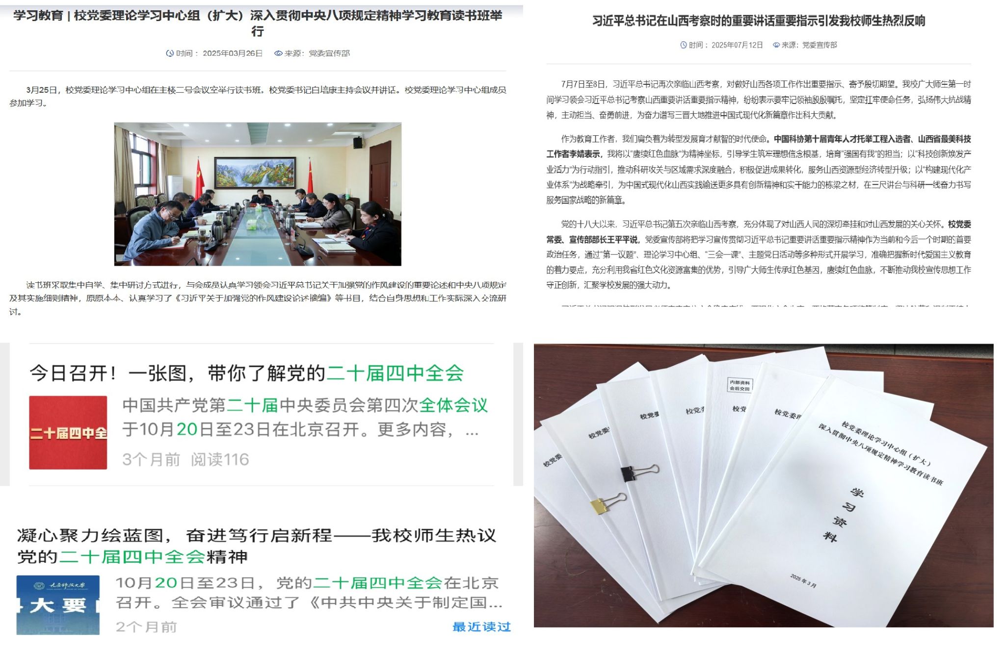 凝心铸魂筑牢思想根基,理论学习有“高度”。抓好校、院两级党委中心组学习,制定了《2025年校、院两级中心组理论学习安排意见》,重点围绕深入贯彻中央八项规定精神学习教育、党的二十届四中全会精神、习近平总书记考察山西重要讲话重要指示精神、《习近平谈治国理政》第五卷等内容,印发学习宣传工作方案和通知,采取读书班、集中学习研讨、联组共学、讲党课、专家讲授等多形式开展学习,全年共制定印发10个月度校、院两级中心组学习通知,组织开展10次校党委中心组理论学习。落实制定的《bat365在线平台登录基层党委理论学习中心组列席旁听工作办法(试行)》,下发2025年度基层党委理论学习中心组列席旁听工作安排,加强对基层党委中心组学习的督查指导。充分利用网站、广播、微信、校报、宣传栏等,设置专题网站,推出专题专栏,加强学习宣传,及时报道学习动态,形成浓厚的学习氛围。统筹抓好宣讲工作,主要依托思政课教师、辅导员、马院研究生和青马工程学员组成的“三团”巡讲开展校内外各类宣讲230场次。